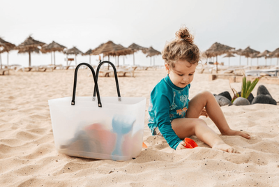 The bag is beautifully neutral and semi-transparent. The patterns in the plastic surface result from the choice of recycled materials.